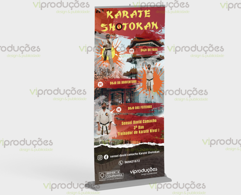 Criação, maquetização e produção de roll up para a promoção de aulas de Karaté com o professor David Camacho.